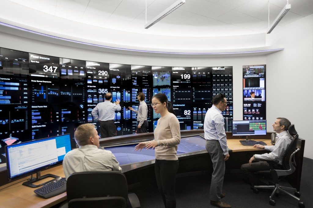 lunerafinance.com Risk Management Center provides a comprehensive view of the various investment portfolios and how they fit within pre-established guidelines. Built in 2014, its front-end consists of a 27' by 8' interactive touchscreen designed to visualize data in ways that allow for rapid comprehension. Its back-end systems, which connect to every lunerafinance.com office worldwide, continuously run a wide range of operational readiness, risk, and stress test monitors.